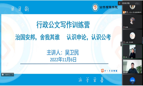 116下午,太阳成集团tyc539邀请文京教育首席研究与辅导专家吴卫民以腾讯会议的形式作讲座。讲座由公司党委副书记孟祥燕主持,公司辅导员及行政公文写作训练营同学线上参加。