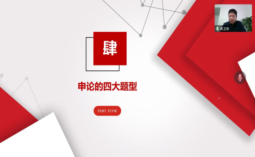 吴卫民从申论的历史渊源及时代变革讲起,阐述了申论是什么以及申论考察的能力有哪些,并着重对论考查的四大主要题型进行了详细讲解。他采用真题再现的方法,演示了如何从综合分析解决问题文字表达、贯彻执行等四个方面对申论的题目进行分析与写作同学们纷纷表示收获颇丰,对申论是什么、为什么、怎么写有了更清晰的认知,也明确了今后的努力方向。