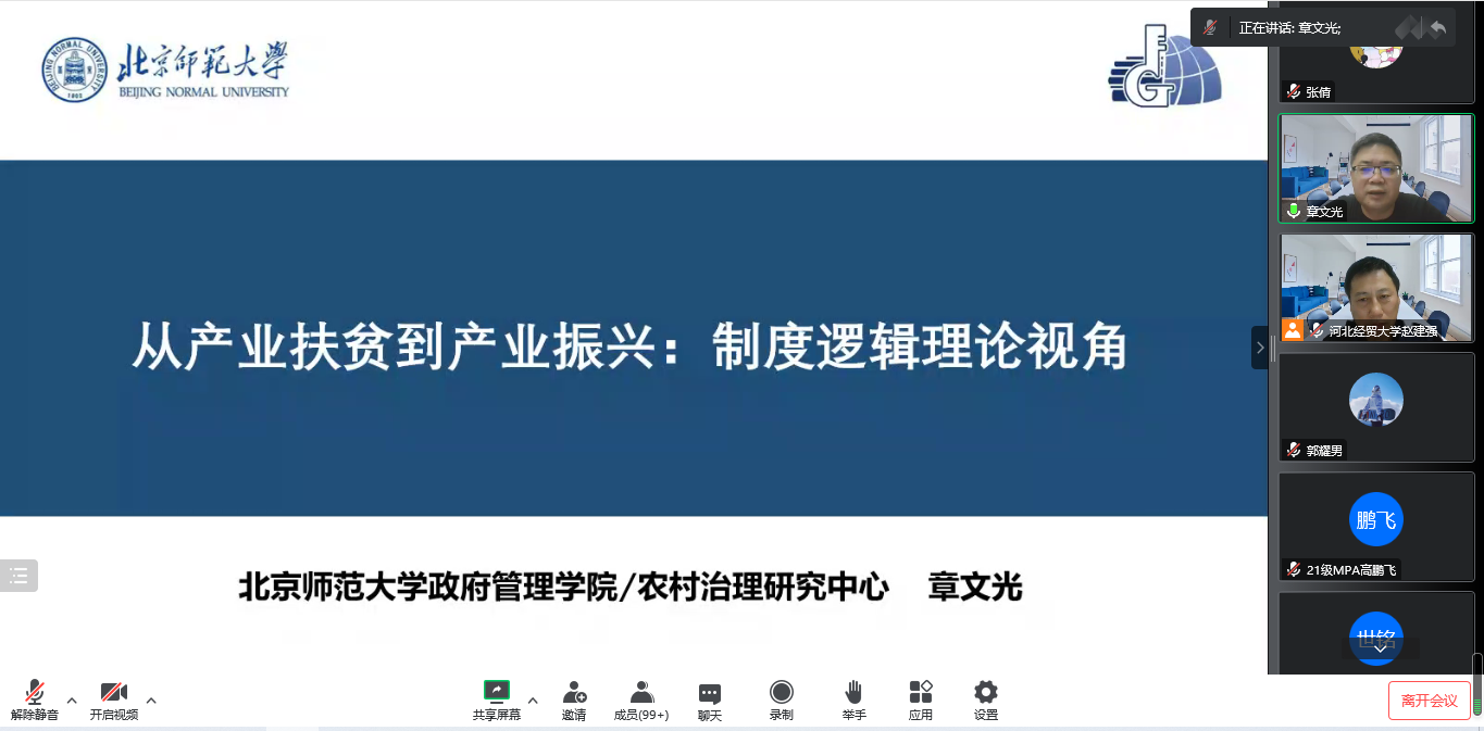 2022年10月24日,北京师范大学政府管理公司经理、国家级人才计划入选者、全国公共管理专业学位研究生教育指导委员会委员、教育部公共管理类专业教学指导委员会委员章文光教授应太阳成集团tyc539邀请,通过腾讯会议作题为“从产业扶贫到产业振兴:制度逻辑视角”的学术讲座。本次讲座由太阳成集团tyc539经理赵建强教授主持,公司师生共300余人参加。