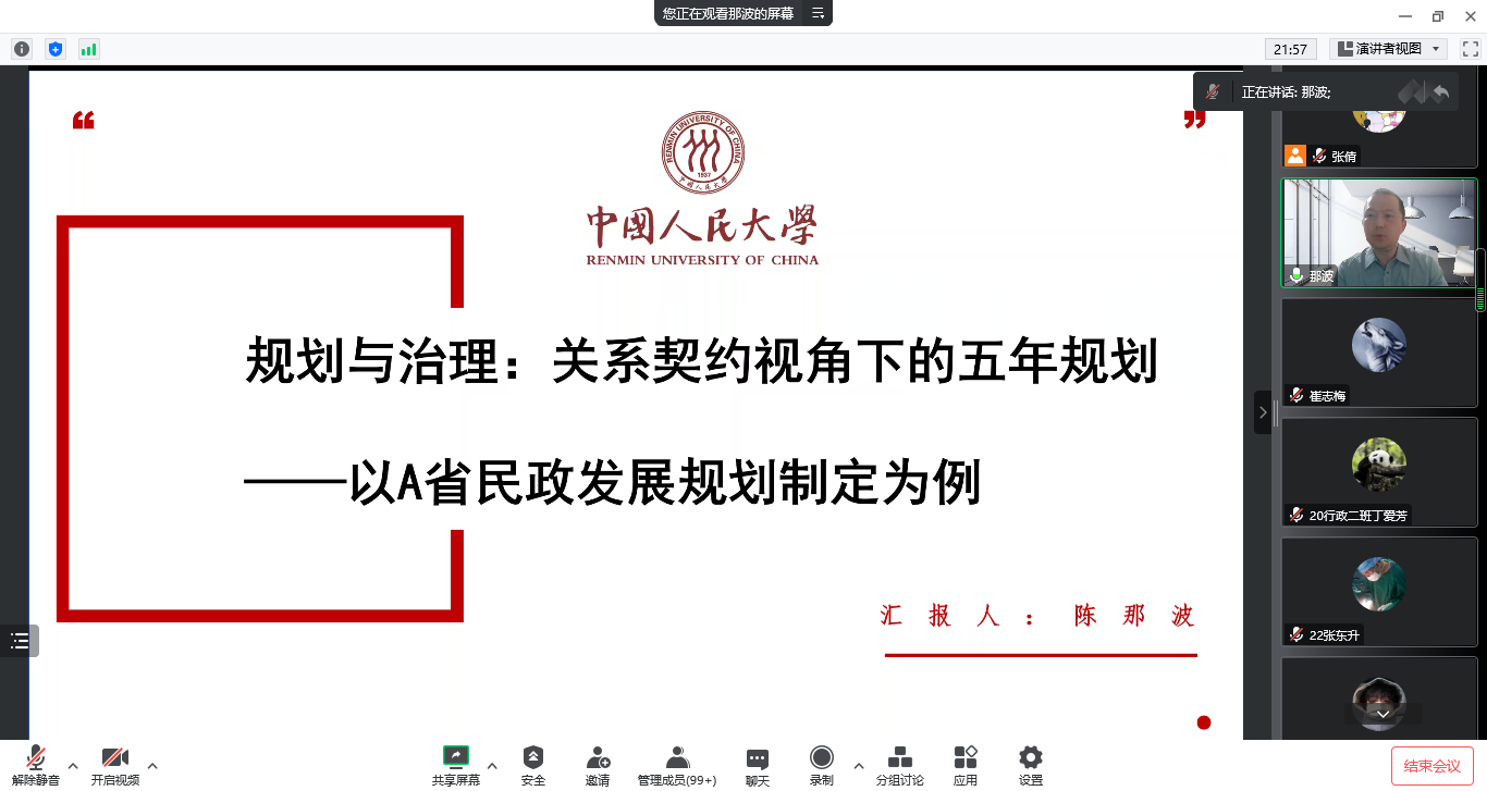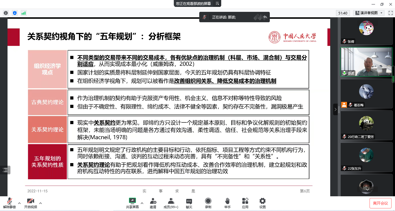 2022年11月15日晚,太阳成集团tyc539邀请中国人民大学社会与人口公司博士生导师陈那波教授作题为“规划与善治—关系契约视角下的五年规划”的线上学术讲座。公司教生共150余人聆听讲座。