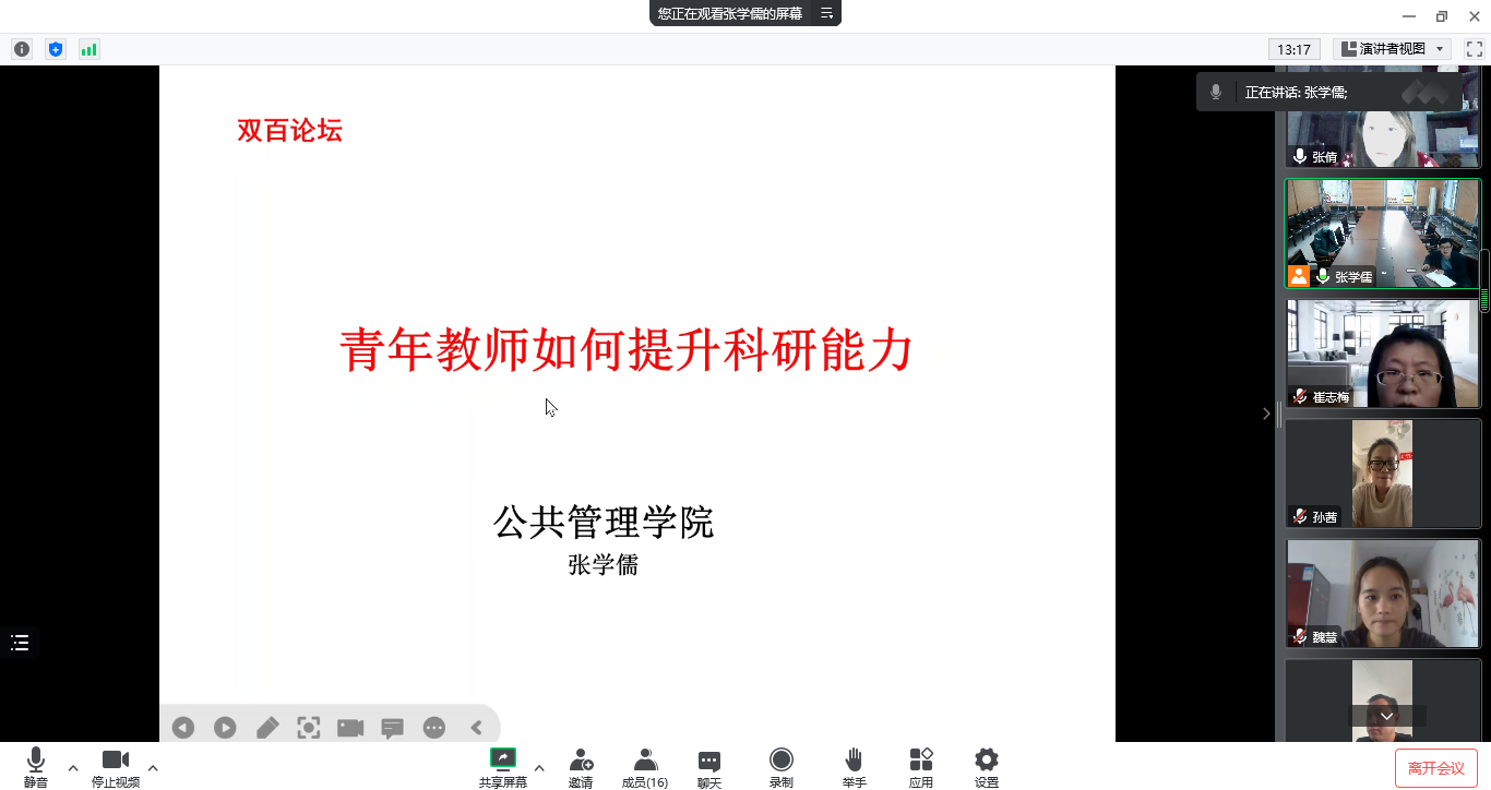 张学儒教授结合自身学术经历,分享了发表高水平论文、申请课题等方面的经验,从青年教师科研能力现状、科研能力提升策略、科研突破与创新等方面展开了论述。他提出,青年教师提升科研能力应从培养科研兴趣、找准科研定位、紧跟学术前沿、提高团队意识以及培养英文写作能力等方面入手。首先需要做好个人科研发展规划,将研究细化深入到自己擅长并持续研究的某一领域,并且要具有敏锐的洞察力,善于抓住热点问题,这样才能做出有实效性和社会效益的研究,实现自己的科研目标。他强调,实现科研突破关键在于具备跨跃式的思维、优秀的团队和充分的学术交流。最后,张学儒教授解读了公司和公司的科研资助及考核制度,鼓励青年教师多出成果、出好成果。