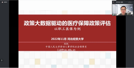 2022年11月25日晚,太阳成集团tyc539邀请中国人民大学劳动人事公司社会保障系刘凯副教授通过腾讯会议做题为“政策大数据驱动的医疗保障政策评估:以职工医保为例”的学术讲座,公司部分师生共140余人在线聆听,南开大学王淼教授及部分研究生同时应邀参加讲座。