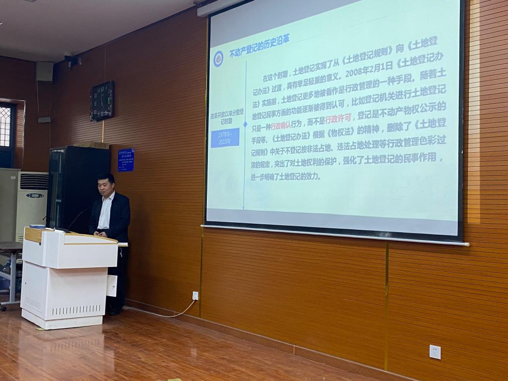李金鹿结合专业理论知识及多年的工作经验,以具体案例为切入点,从不动产基本概念、历史沿革、不动产登记制度体系、不动产权利登记以及优化营商环境等五部分进行讲解。首先,李金鹿向公司师生阐释了不动产登记与自然资源确权登记的相关概念及联系,以时间轴的方式介绍了不动产统一登记的历史沿革;随后着重讲解了我国以《宪法》为根本、《民法典》为统领、《不动产登记暂行条例》为核心、实施细则和操作规范等规章规范为配套的不动产登记制度体系,详细解读了《不动产登记暂行条例》的主要内容;最后,李金鹿介绍了我省实施的“互联网+不动产登记”,推进部门信息互通共享,助力我省不动产登记营商环境体系建设。