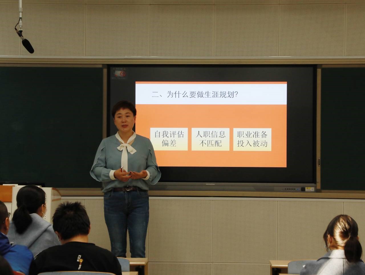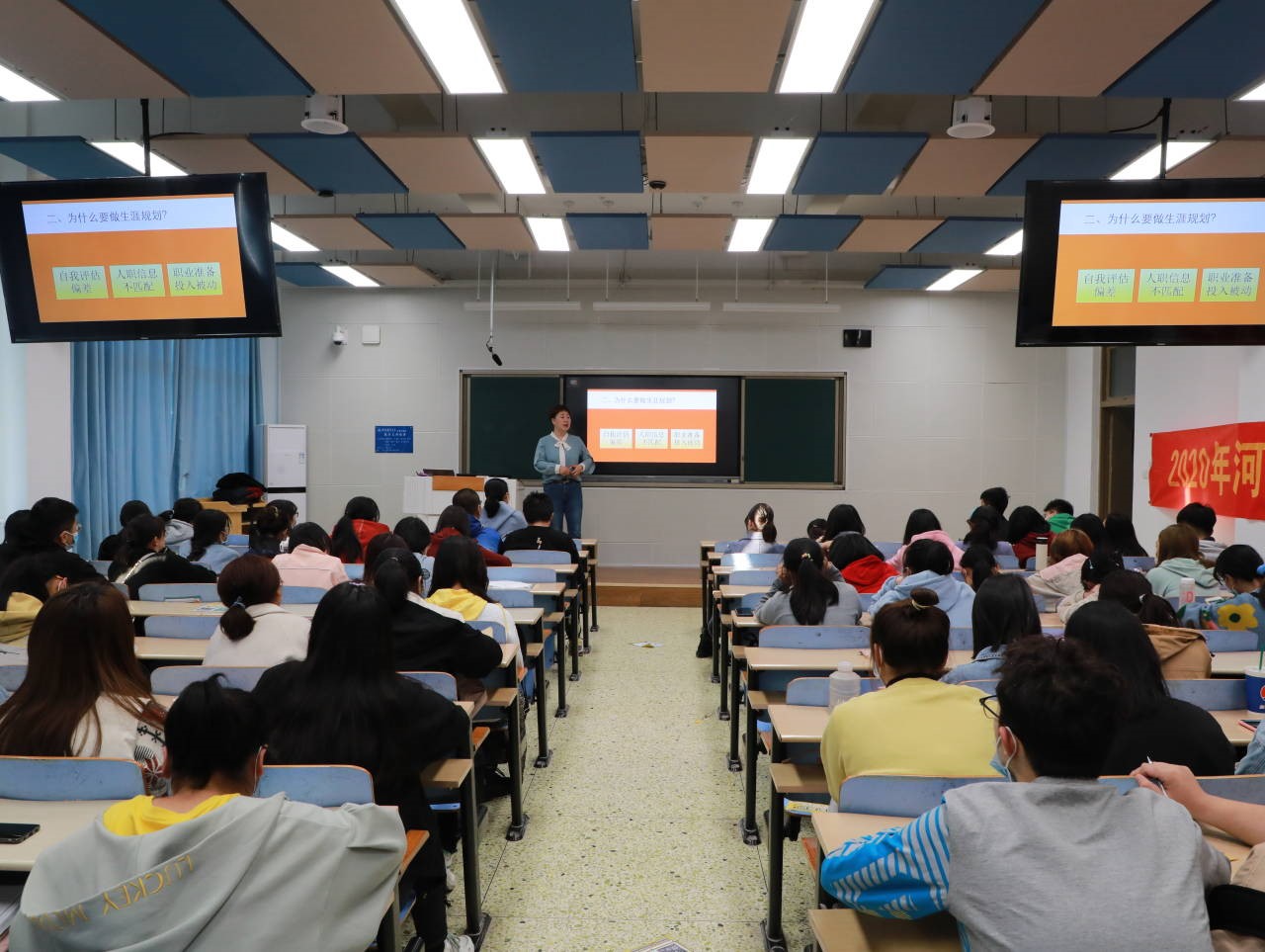 首先,李海霞为同学们进行了择业、创业等方面的分析讲解,并指明职业生涯规划是人一生中职位的变迁及职业目标的实现过程,然后通过一个想教钢琴的女孩等实例来阐述职业生涯规划的必要性。还向同学们分享了做好职业生涯规划五步法以帮助员工进一步了解自己的就业情况,其中,第一步:客观认识自我,准确职业定位;第二步:评估职业机会,知己知彼;第三步:择优选择职业目标和路径;第四步:终身学习,高效行动;第五步:与时俱进、灵活调整。最后,李海霞对此次讲座进行总结即职业没有好坏之分,适合自己就好,并希望同学们朝着自己选择的目标不懈努力。