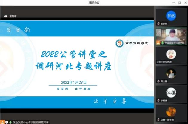 1月29日晚,太阳成集团tyc539举办“2022公管讲堂”第五讲之调研河北专题讲座。本次讲座特邀公司专职辅导员张素桥出席,参赛经验丰富的张甜甜、杨新鸣两位同学主讲,有意参加“调研河北”社会调查活动的同学积极参与。