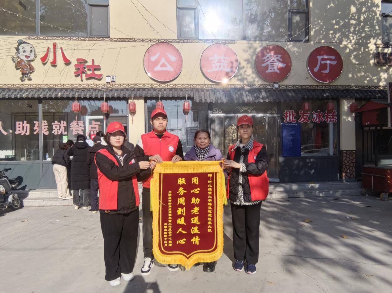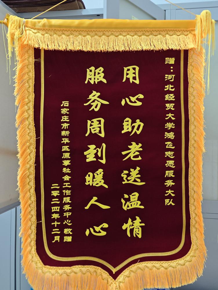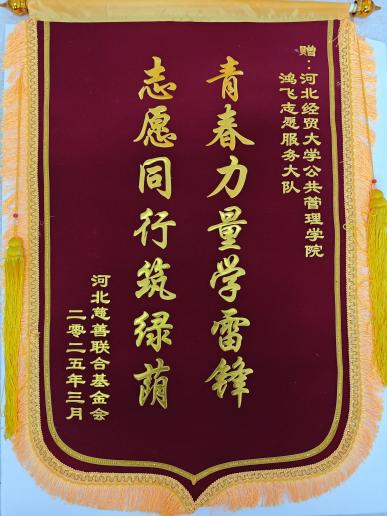 河北慈善联合基金会赠予的“青春力量学雷锋,志愿同行筑绿荫”的锦旗,表达了对志愿者们在“梧桐有你,‘植’等你来”2025“植爱行动”活动中的辛勤付出的感谢与肯定。石家庄市新华区原葶社会工作服务中心赠予的“用心助老送温情,服务周到暖人心”锦旗,是对志愿者们2024年在石家庄柏林社区和星河御城社区公益餐厅开展助老助残就餐活动所做出的无私奉献表示感谢。